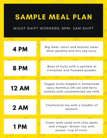 | Night shift | Pre-shift meal / Mid-shift snack / Light post-shift meal | Protein + whole grains |